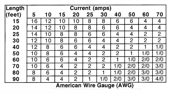 As important as the above considerations are, one must carefully consider the wire gauge, which is dictated by the amount of current you want to draw and the distance to be covered. Generally speaking you'll want to double the length you'll run, since you'll be dropping voltage across the hot and ground leg. The chart below will be useful for determining gauge. In most cases you'll find 10AWG will do the job for typical 2-meter 50W rig and possibly for a 100W HF rig if the run is short enough (otherwise 8AWG would be better). As amps needed and length of wire run goes up, the gauge size will be lower. Always keep your wire runs as short as possible.