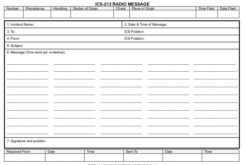 When FEMA adopted ICS it developed its own message form, without considering how it would be communicated to and from remote locations. The ICS-213 message form bears similarity to our Radiogram and can be converted into, and communicated via, Radiograms.